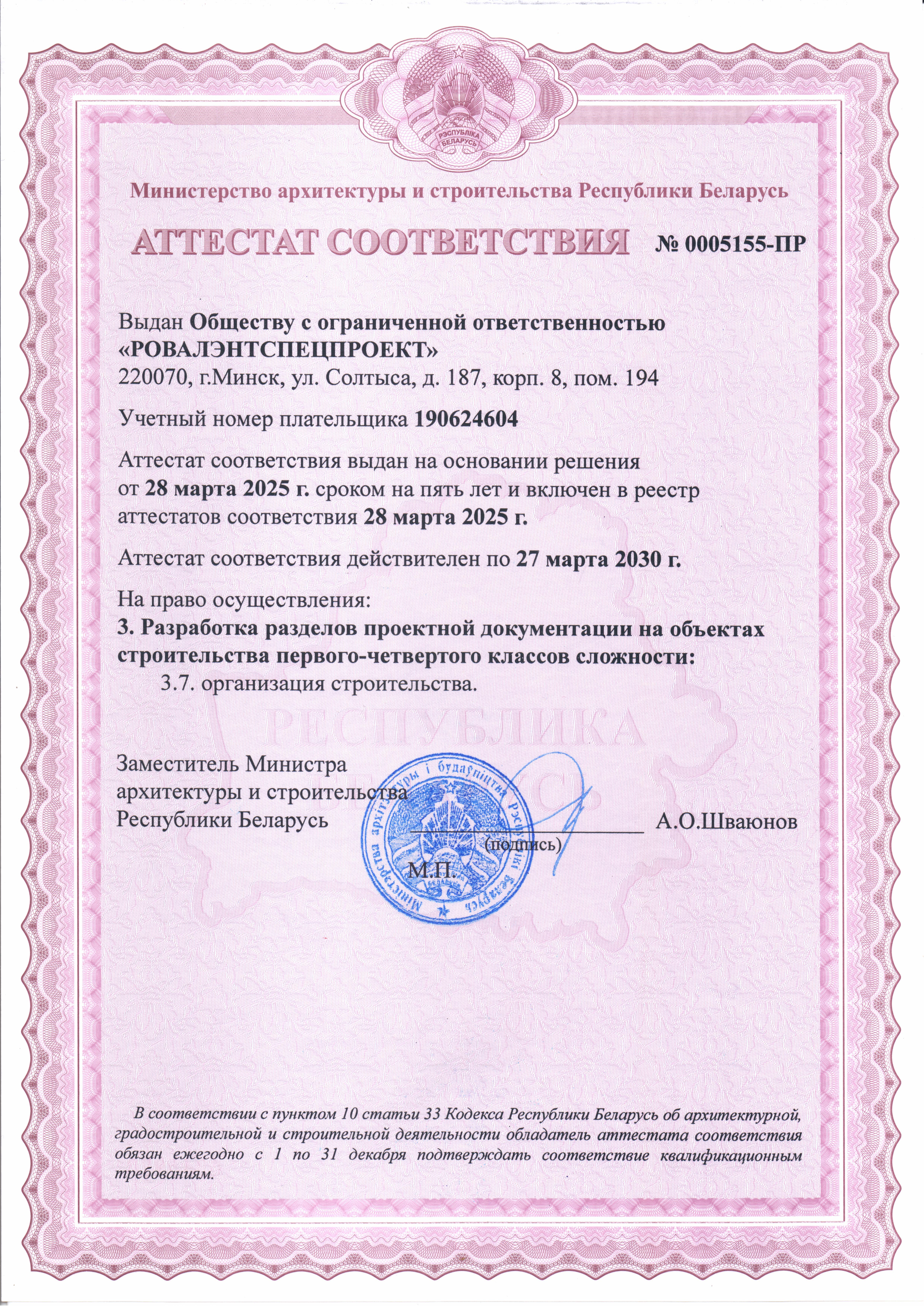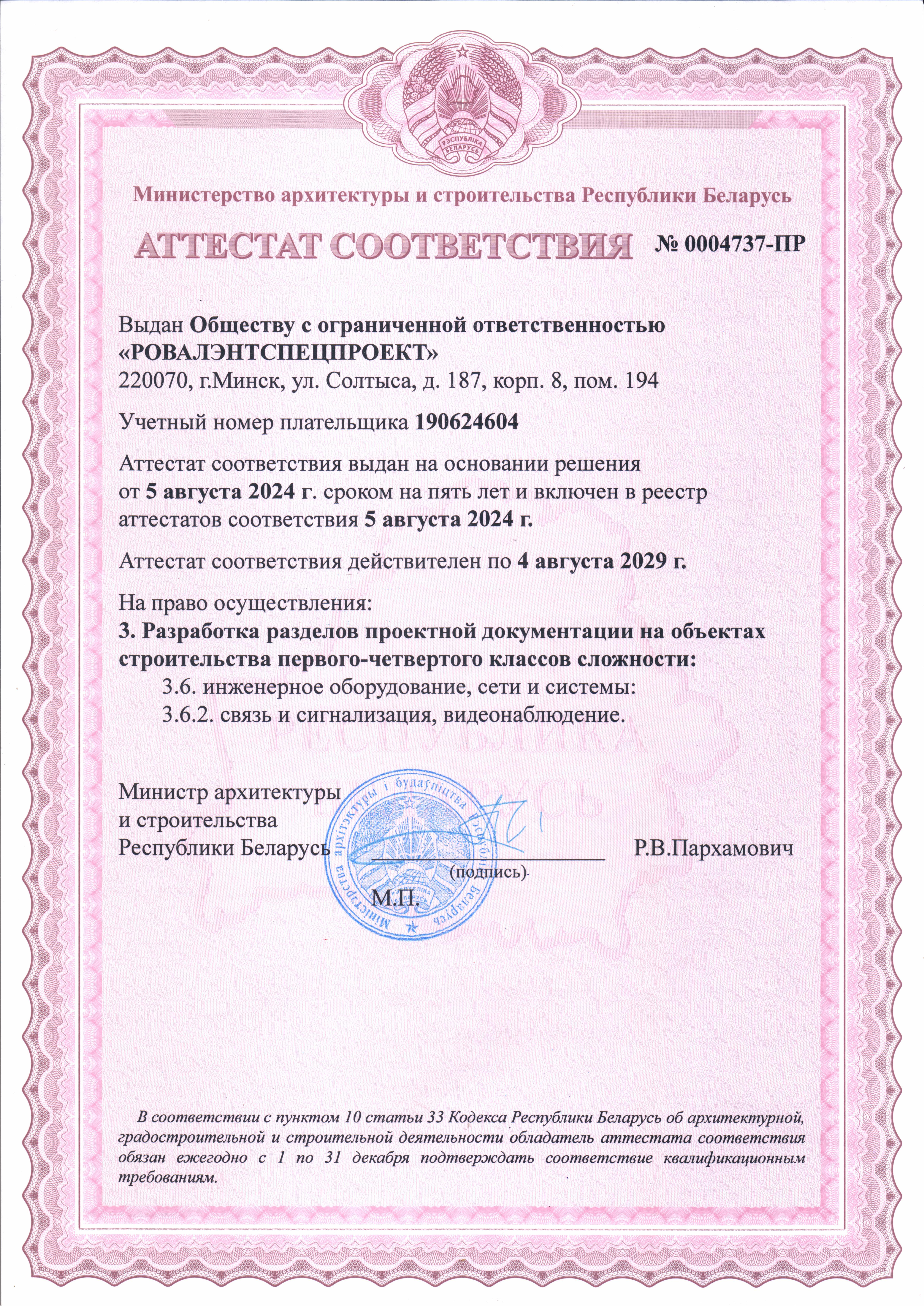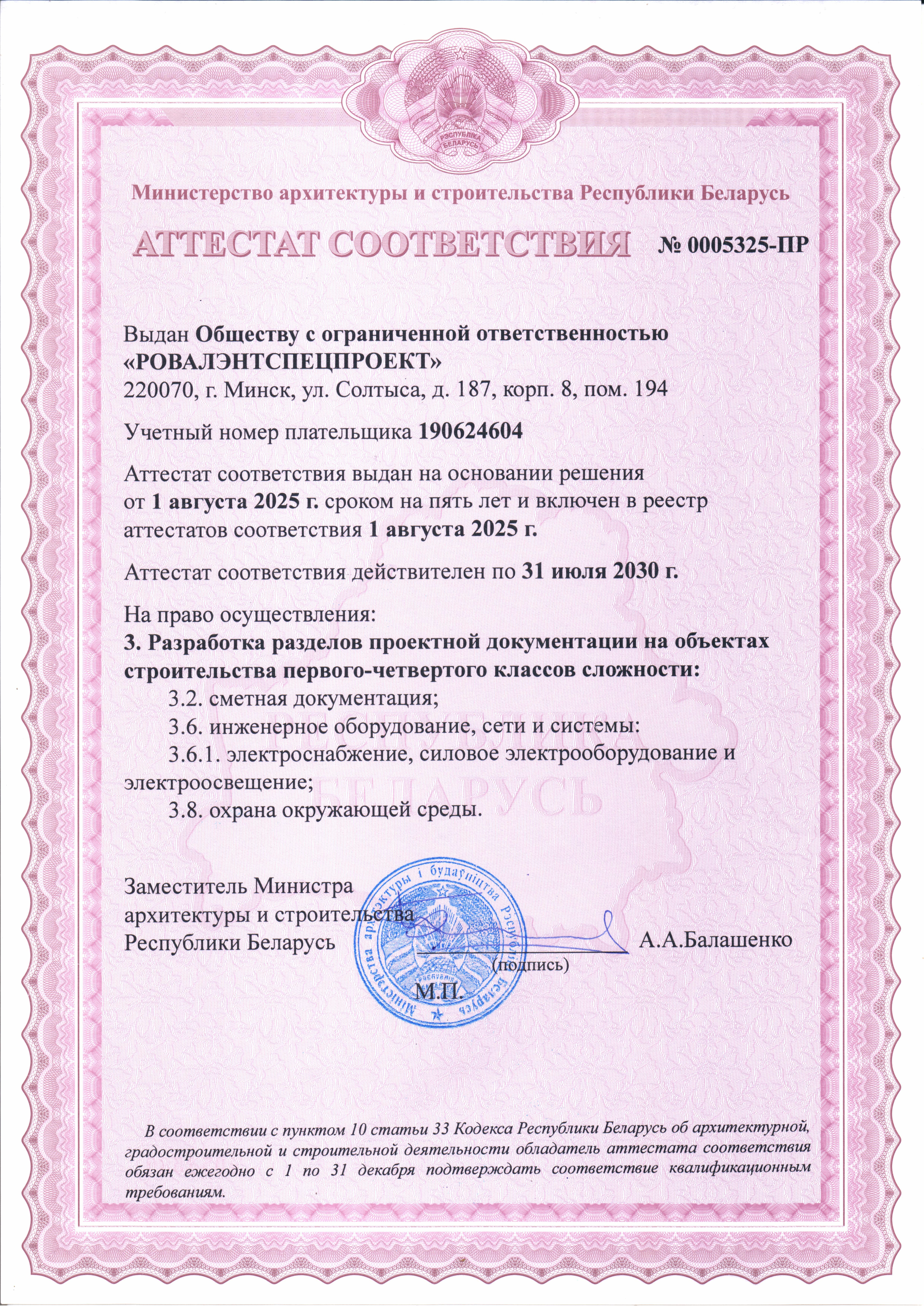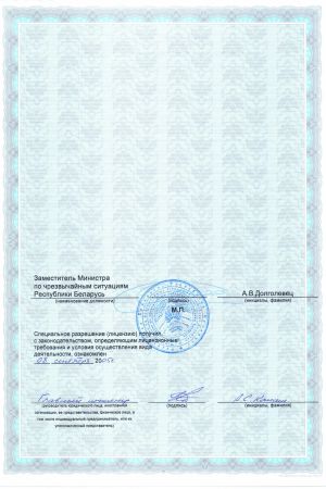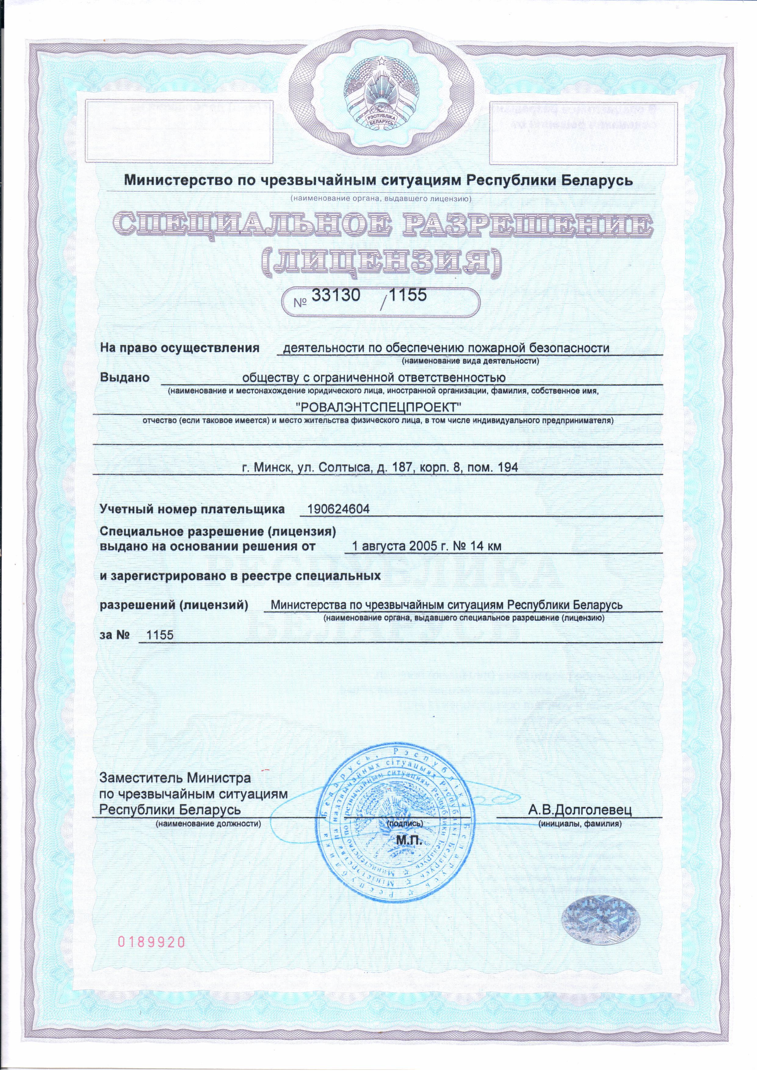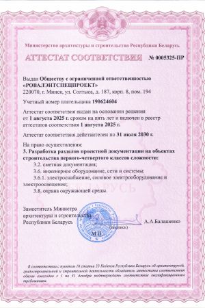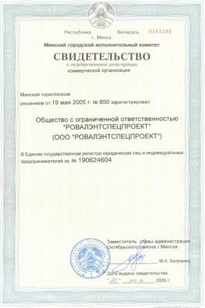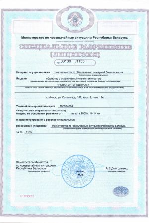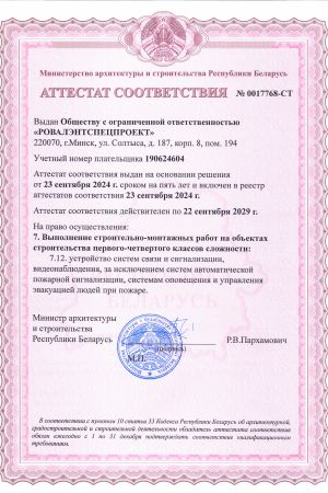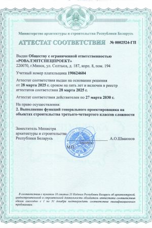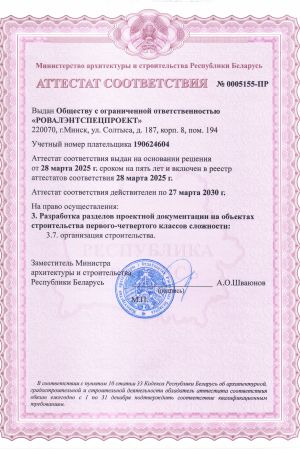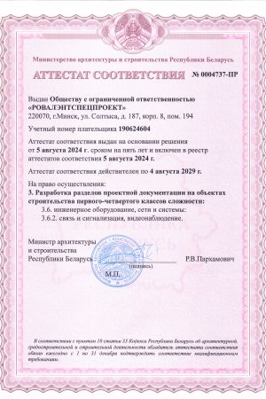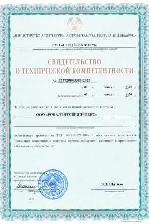 ООО «РОВАЛЭНТСПЕЦПРОЕКТ» для обеспечения своей деятельности имеет необходимые лицензии МЧС и МВД Республики Беларусь, аттестаты соответствия на право осуществления деятельности в области строительства, а также свидетельство о технической компетентности системы контроля качества, выданные министерством по архитектуре и строительству Республики Беларусь.
