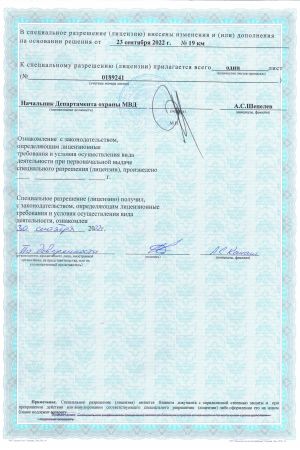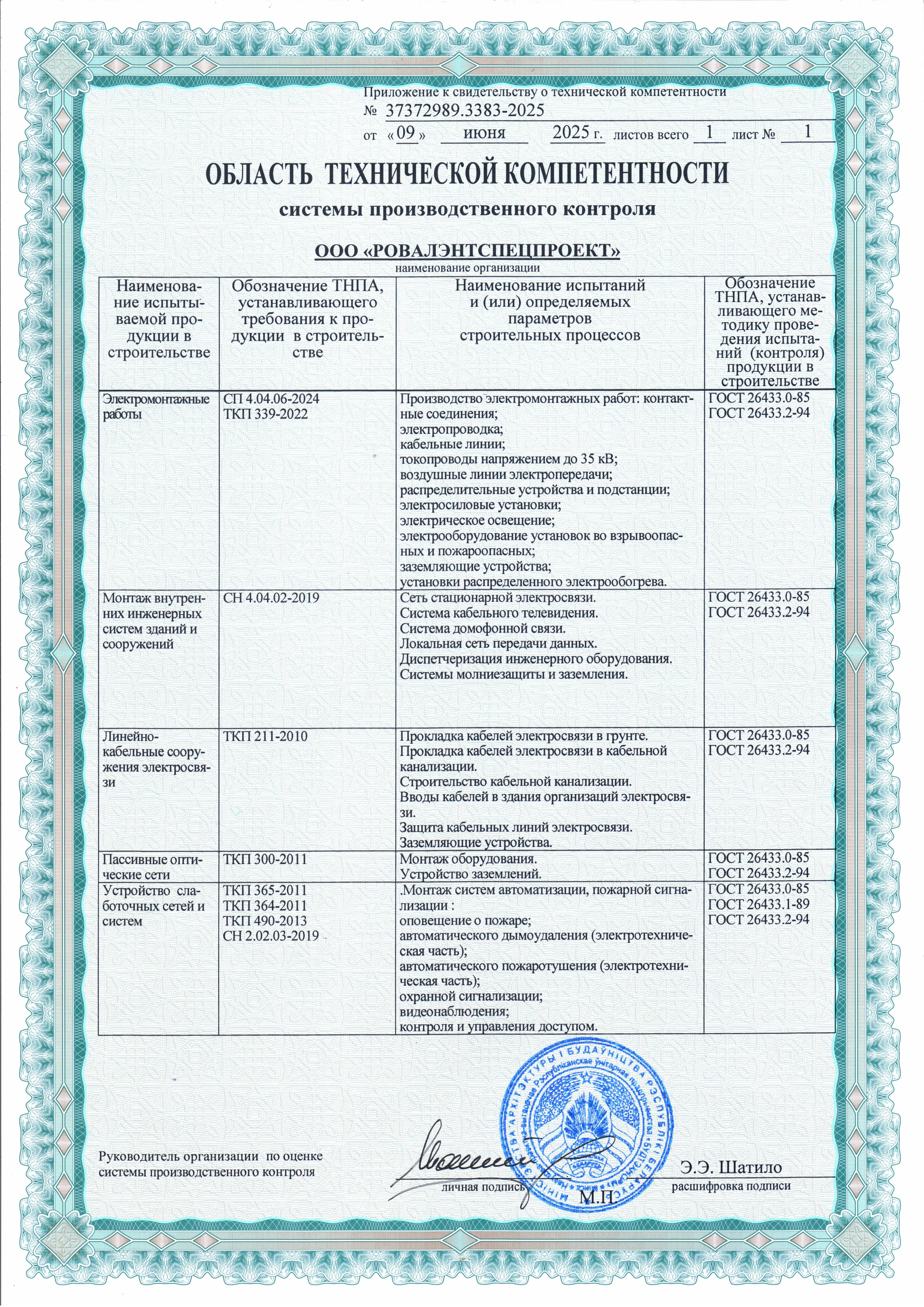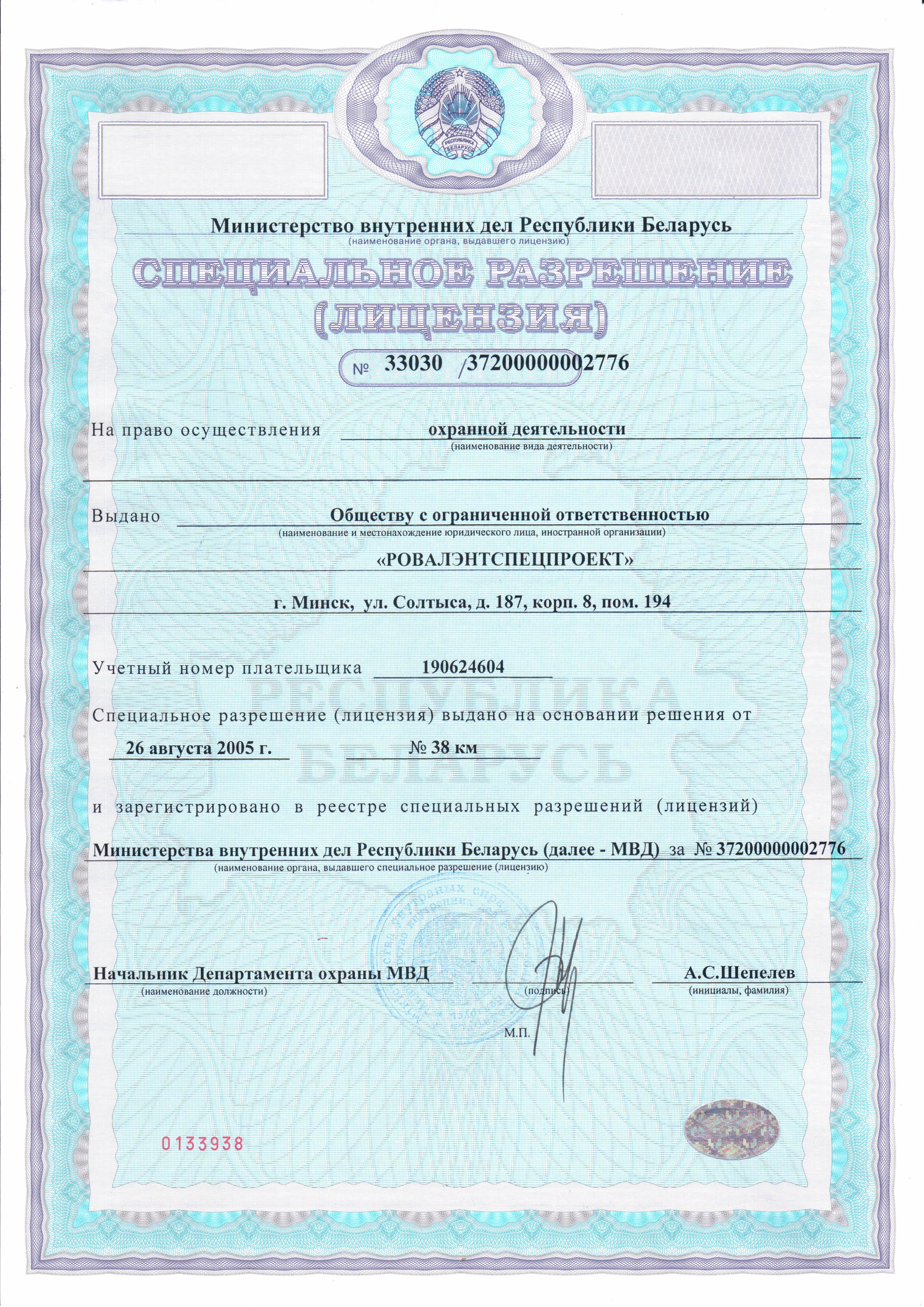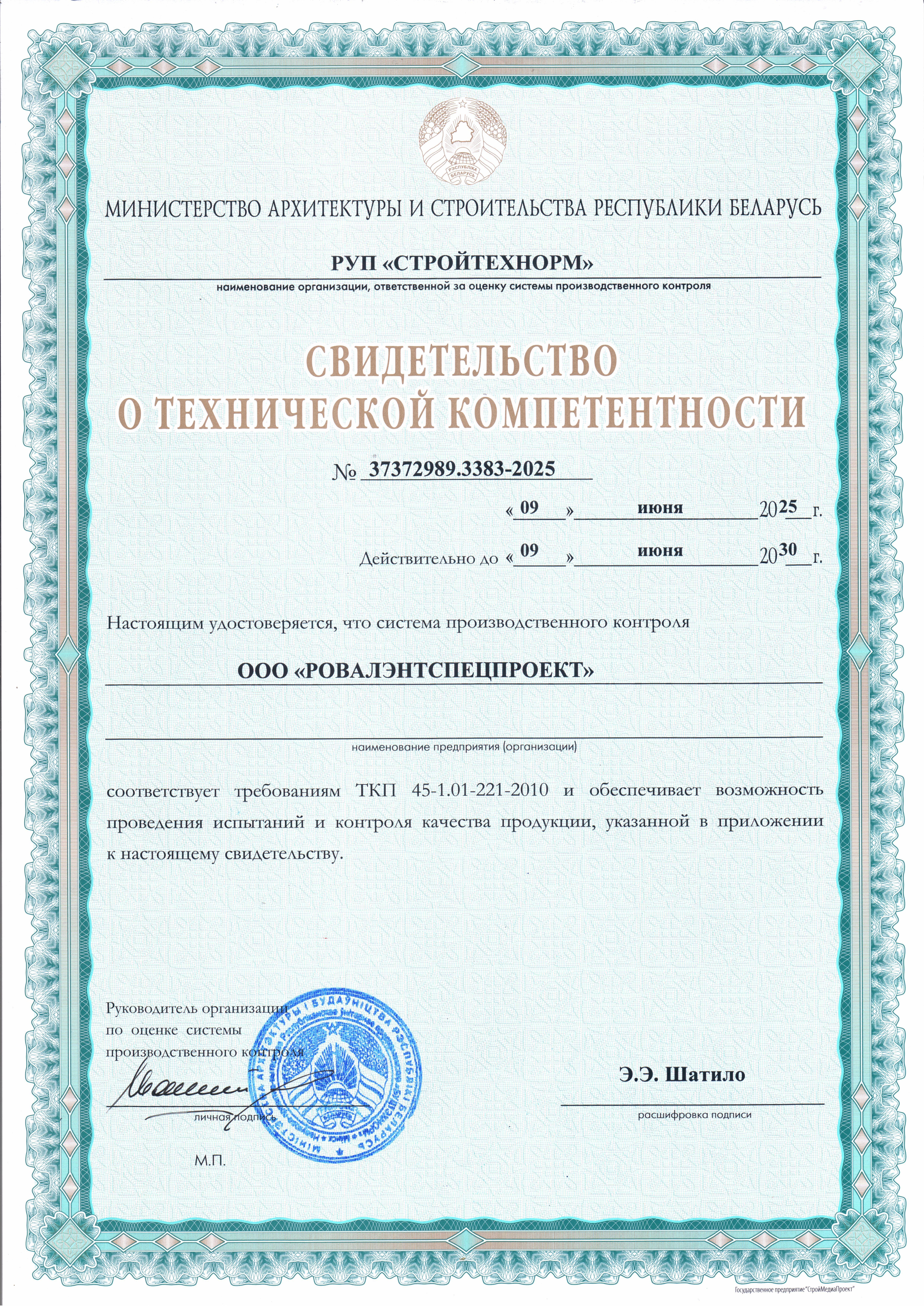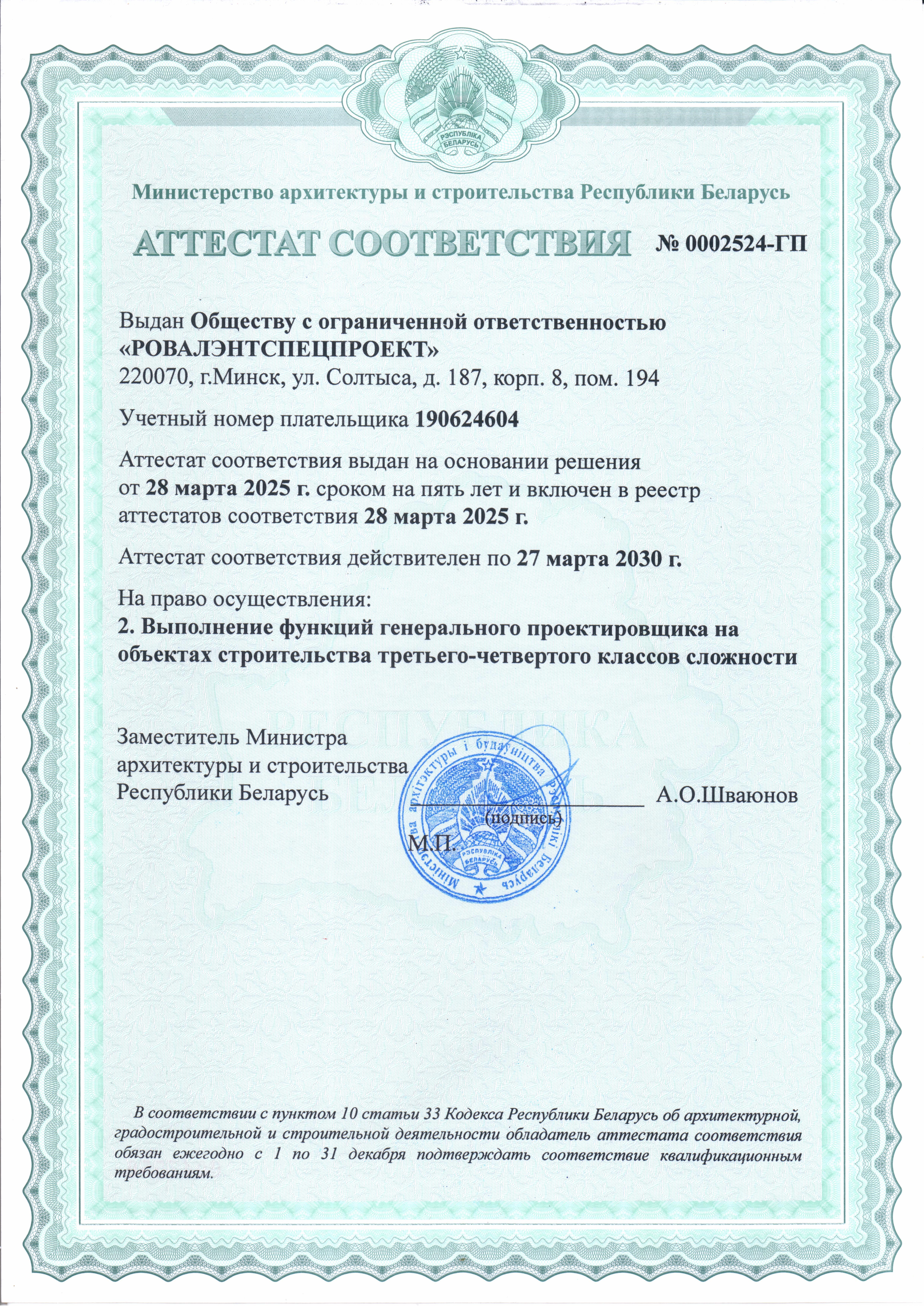 ООО «РОВАЛЭНТСПЕЦПРОЕКТ» для обеспечения своей деятельности имеет необходимые лицензии МЧС и МВД Республики Беларусь, аттестаты соответствия на право осуществления деятельности в области строительства, а также свидетельство о технической компетентности системы контроля качества, выданные министерством по архитектуре и строительству Республики Беларусь.