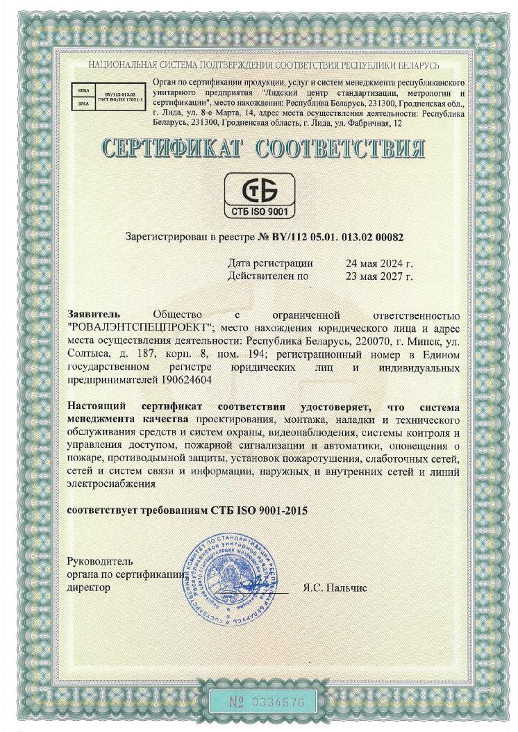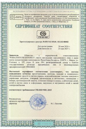 Для повышения качества предоставляемых услуг предприятие ООО «РОВАЛЭНТСПЕЦПРОЕКТ» сертифицировано Ассоциацией по сертификации «Русский Регистр» на соответствие системе менеджмента качества по стандарту ИСО 9001:2000 в отношении проектирования, монтажа, наладки и технического обслуживания средств охраны, пожарной автоматики, сетей и систем связи, информации.